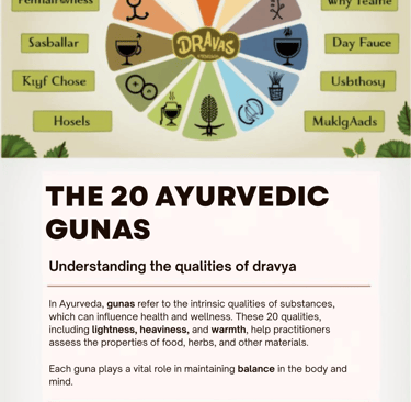 In Ayurveda, everything in the universe, including our bodies and the food/medicine we consume, is composed of five fundamental elements (Panchamahabhuta): Earth, Water, Fire, Air, and Ether. The Gunas are the fundamental physical and energetic qualities that arise from these elements. They are inseparable from a substance (Dravya) and define its properties and effects on the body.